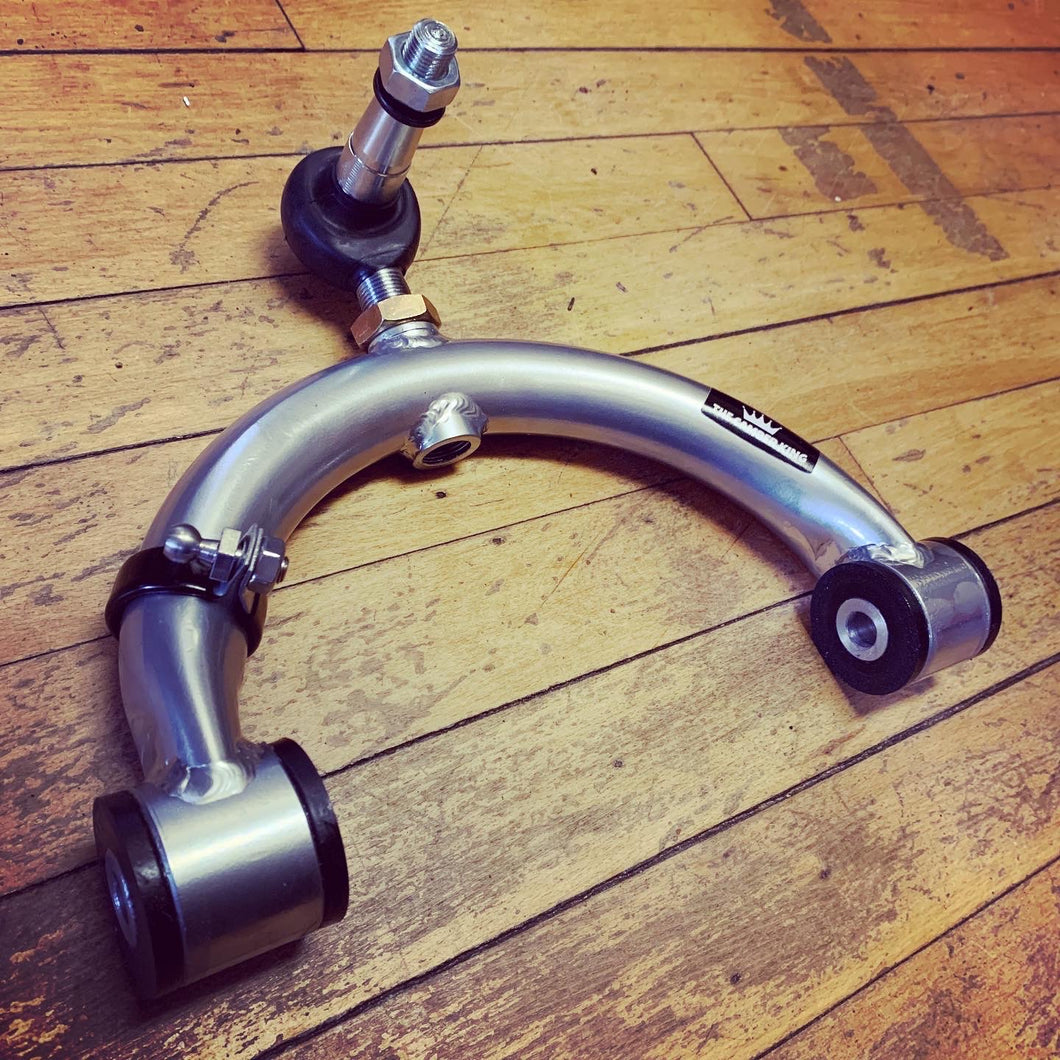 Fourth generation Jeep Grand Cherokee 2011 - present adjustable front camber arms. These kits are fabricate here in the United States. The curve steel rod is cold bend and milled on both ends to be weld to the pipe (barends) that house the Energy Suspension bushings. The heim joint is chromoly coupled with the zinc plated steel pin.