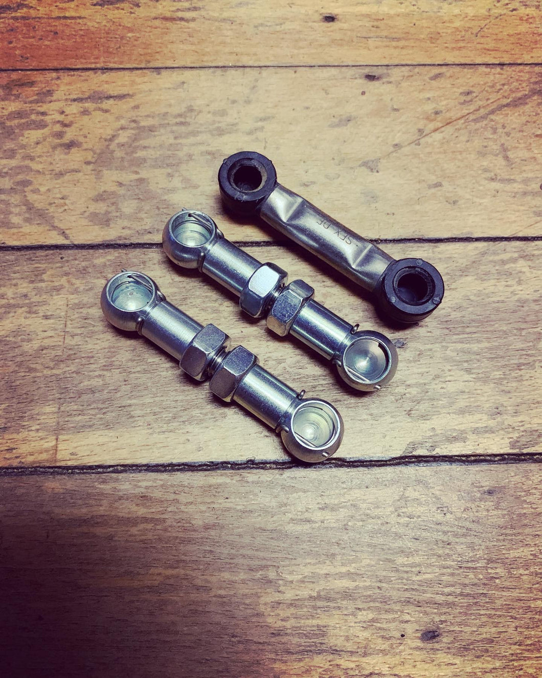 For the fronts, the longer the link is adjusted, the lower your car will go. The back is the opposite, the shorter the link the lower the body drops. There are two lock nuts on both ends of the hexagonal bar where you lock your desired height position.